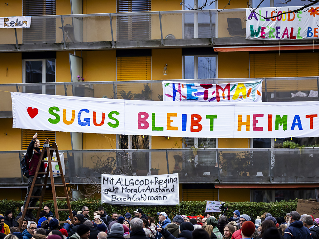 Des habitants concernés, mais aussi de nombreuses personnes venues en soutien se sont retrouvés pour manifester dimanche sous la bannière "Sugus bleibt Heimat" (Sugus reste notre maison).