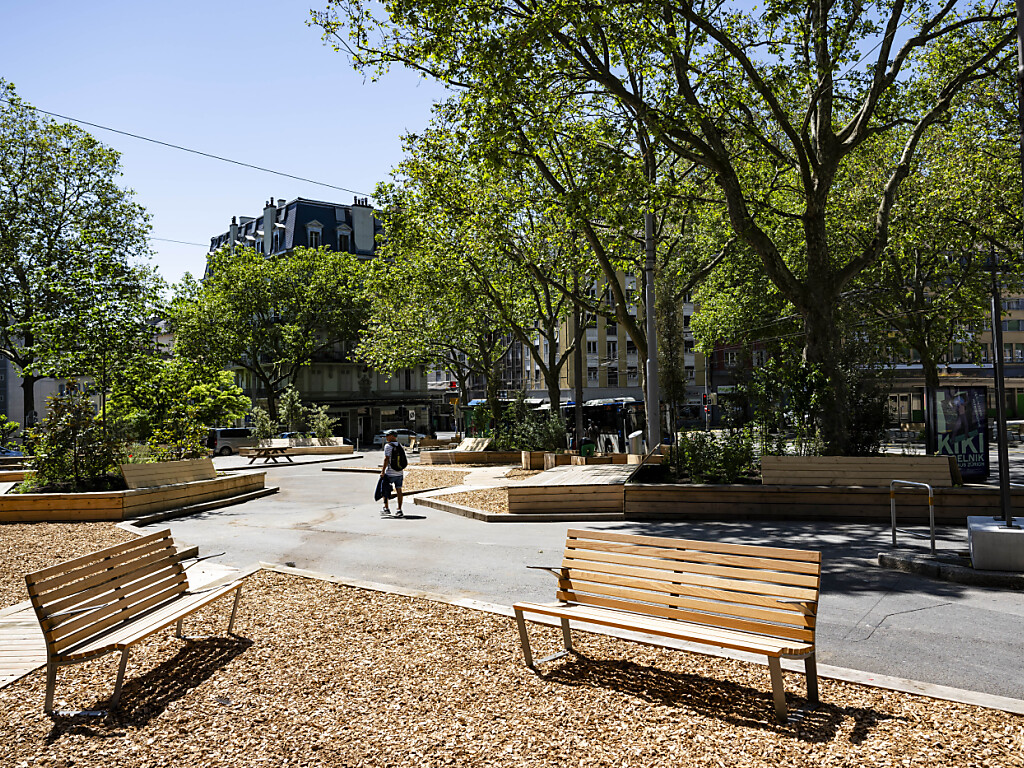De nombreux bancs et des tables occupent désormais le sud de la place du Tunnel. (© KEYSTONE/JEAN-CHRISTOPHE BOTT)