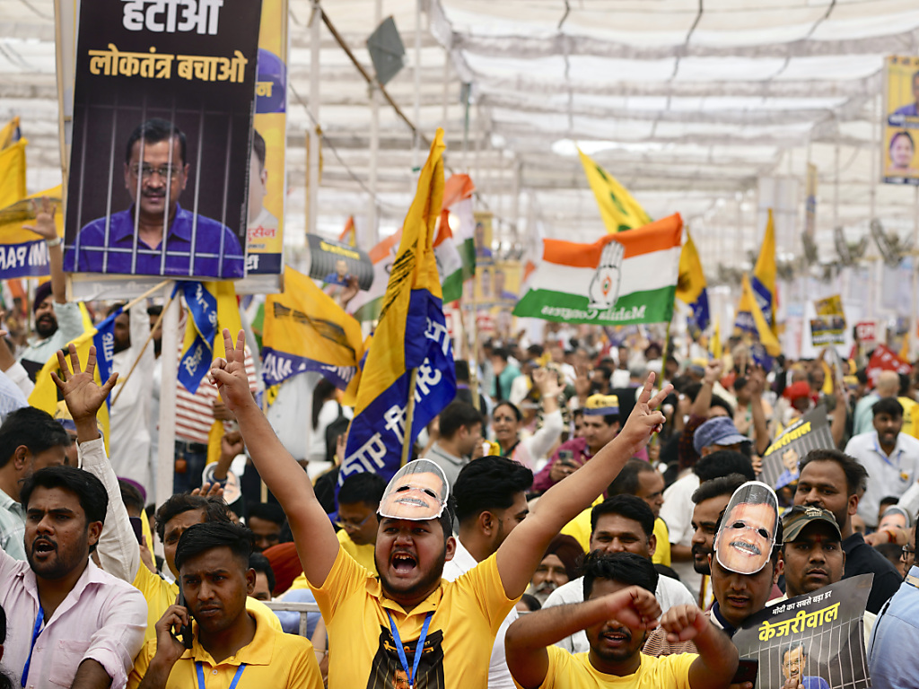 Des milliers de sympathisants de l'opposition indienne se sont rassemblés dimanche à New Delhi pour dénoncer l'arrestation d'un de leurs dirigeants, Arvind Kejriwal, qui est en détention provisoire dans le cadre d'une enquête pour corruption. (© KEYSTONE/AP/Manish Swarup)