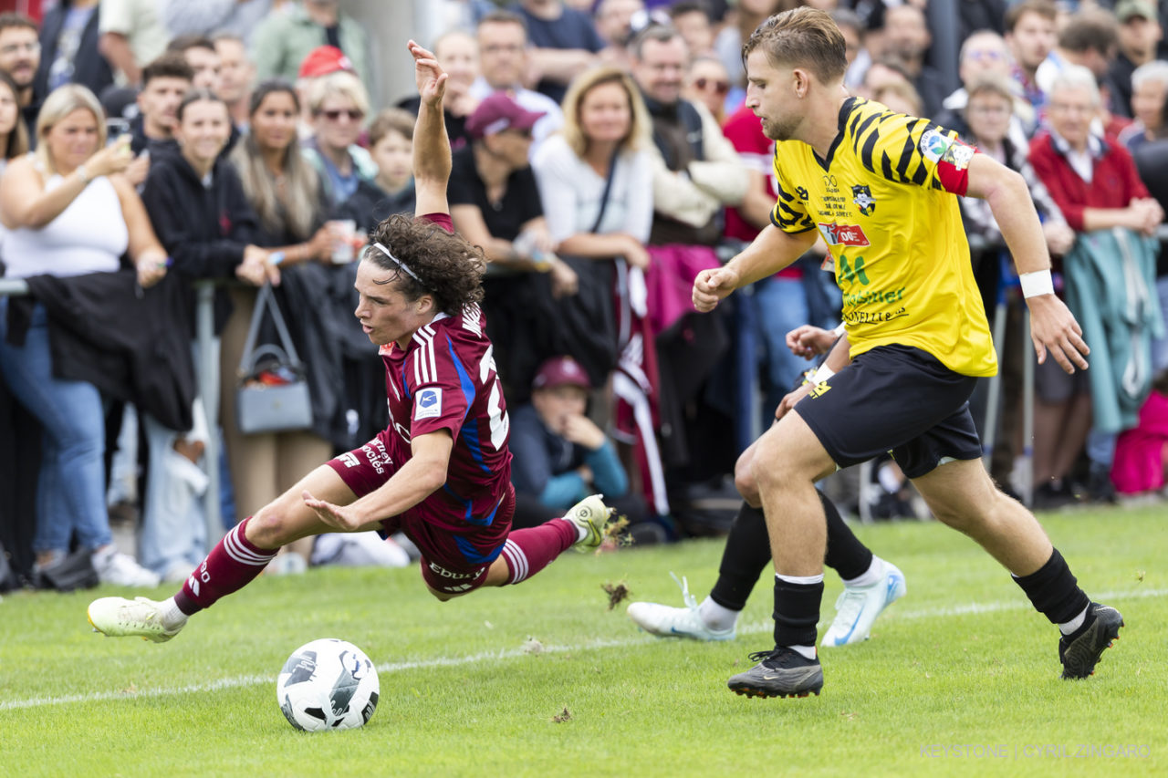 Comme à son habitude, Theo Magnin, en grenat, opposé ici au Bernésien Yannis Vidakovic, en jaune et noir, n'a pas ménagé sa peine; l'ancien junior de Laconnex a inscrit le premier but de sa carrière sous le maillot servettien (© KEYSTONE/Cyril Zingaro)