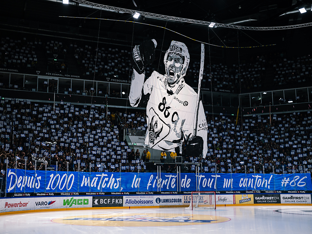 Le tifo des supporters fribourgeois pour célébrer les 1000 matches de Julien Sprunger lors du derby contre Berne. (© KEYSTONE/ADRIEN PERRITAZ)