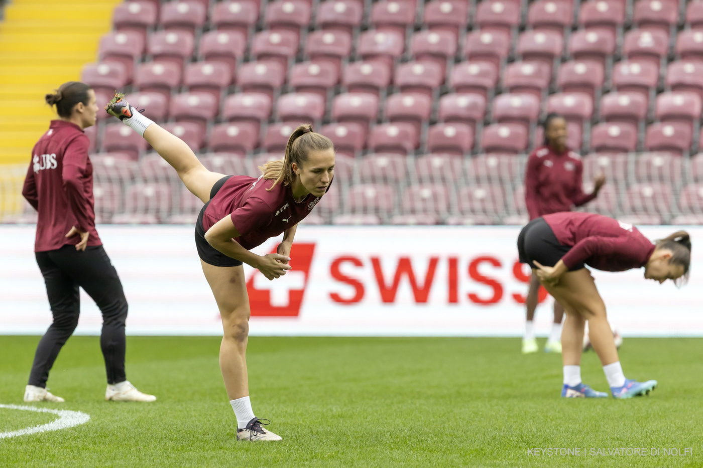 Laura Tufo, en grenat, Maja Jelcic, n°99, et leurs coéquipières se retrouveront fin mars à Winterthour (© KEYSTONE/Peter Klaunzer/archives).