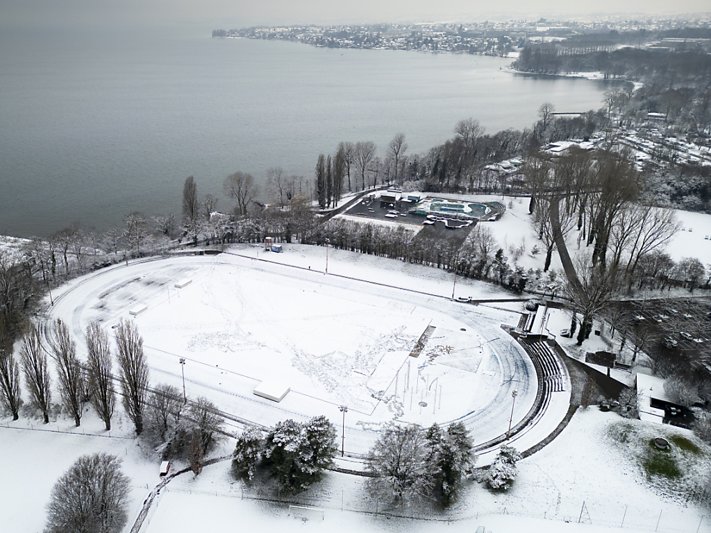 Situé au bord du lac, le Stade Pierre-de-Coubertin sera modernisé et accueillera à l'horizon 2028-29 le meeting international Athletissima. (© KEYSTONE/LAURENT GILLIERON)
