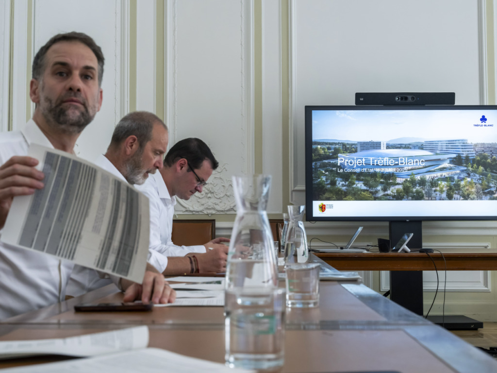Trois conseillers d'Etat genevois étaient présents pour présenter aux médias la demande de crédit de la nouvelle patinoire du Trèfle-Blanc. (© KEYSTONE/MARTIAL TREZZINI)