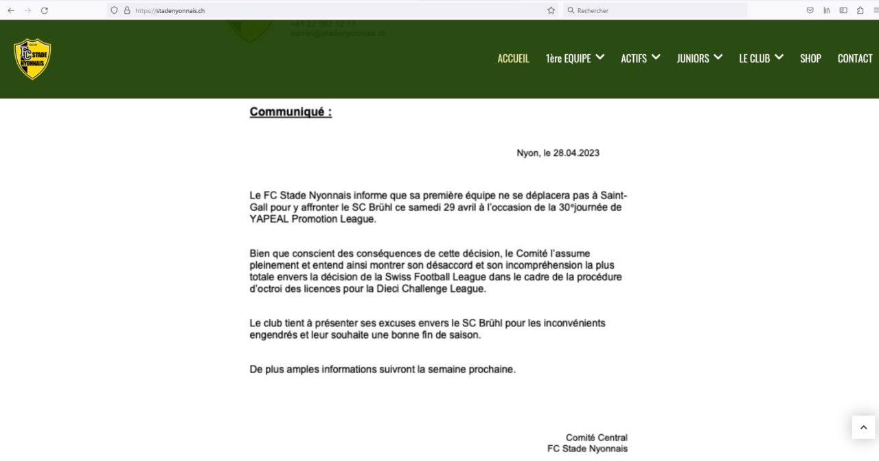 C'est assez rare pour être signalé. Actuellement deuxième de Promotion League, le Stade Nyonnais qui ambitionnent d'évoluer en Challenge League la saison prochaine a décidé de ne pas jouer samedi en Suisse orientale face à Brühl Saint-Gall. Pour la direction du club "jaune et noir", il s'agit de protester contre les conditions d'octroi des licences de la Swiss Football League (SFL) pour évaluer dans l'antichambre de l'élite. Outre le match perdu par forfait, il pourrait y avoir d'autres sanctions.