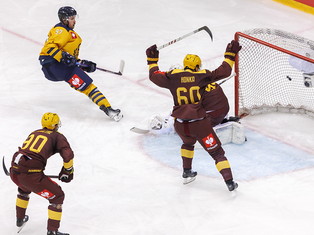 Après être passé entre Simon Le Coultre et Julius Honka, Gabriel Fontaine marque le 2-1 pour Lukko Rauma. (© KEYSTONE/EPA/SALVATORE DI NOLFI)