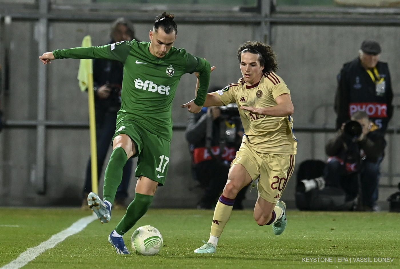 Aligné dès le coup d'envoi comme au match aller, le jeune joueur genevois Théo Magnin, n° 20, a une fois de plus livré une prestation digne d'éloges (© KEYSTONE/EPA/VASSIL DONEV).