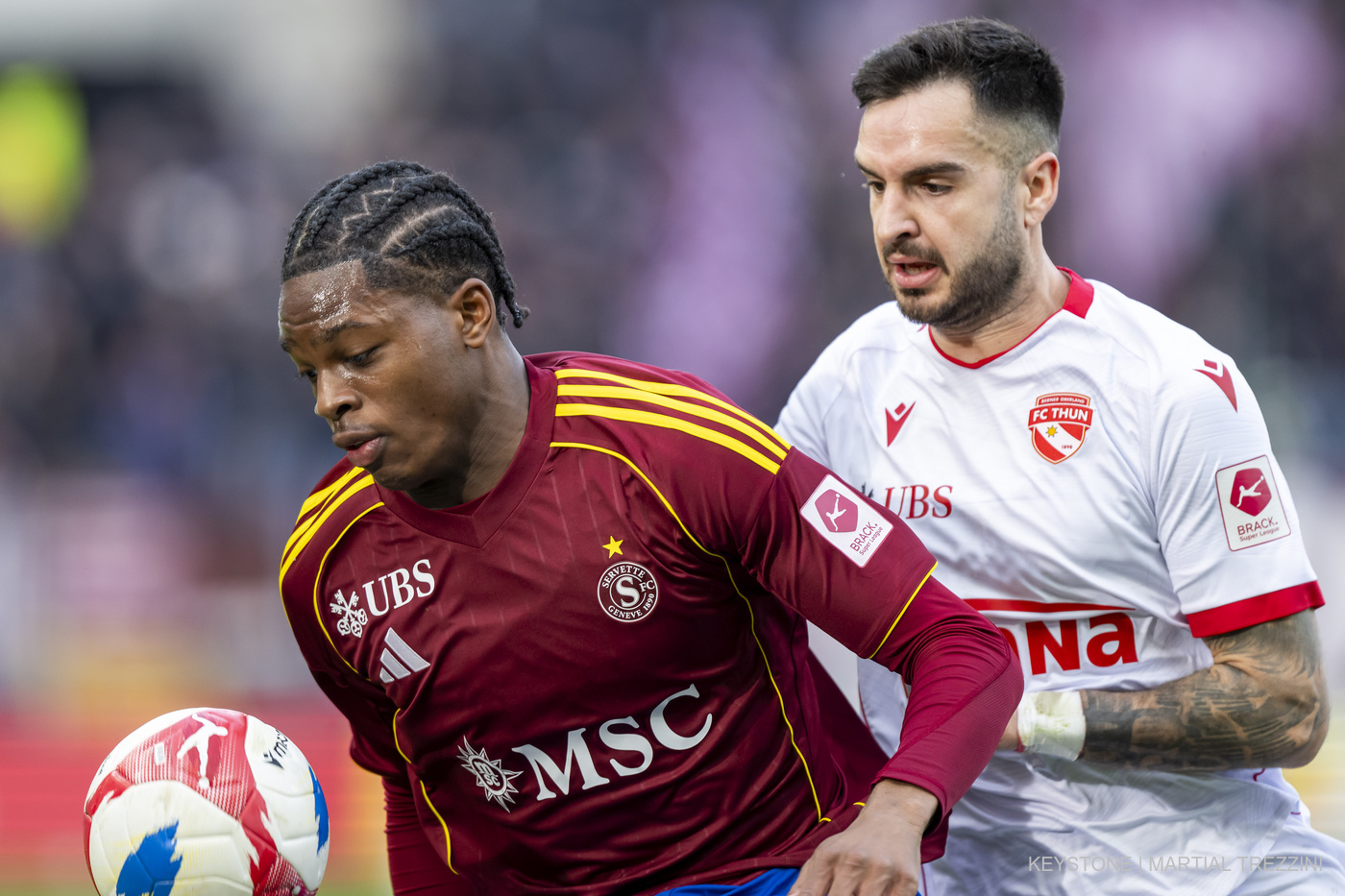 Entré en jeu au cours de la seconde période, Jamie Atangana, en grenat, serré ici de près par Genis Montolio, en blanc, a marqué le seul et unique but de son équipe à la dernière minute du match (© KEYSTONE/Martial Trezzini).