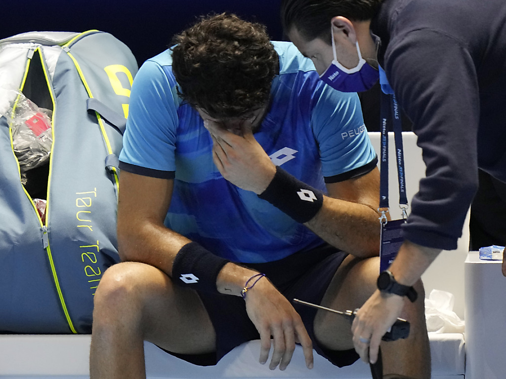 L'Italien a jeté l'éponge alors qu'il était mené 7-6 (9/7) 1-0. Il a, semble-t-il, fait un faux mouvement sur un coup droit. Après avoir été soigné pendant six minutes, il est revenu sur le court pour jouer et perdre un point sur sa mise en jeu. Incapable de frapper à pleine puissance, il a logiquement abandonné sans pouvoir dissimuler ses larmes. Il paraît bien improbable qu'il soit en mesure de tenir sa place mardi contre Hubert Hurkacz. Le premier remplaçant du Masters est Jannik Sinner.