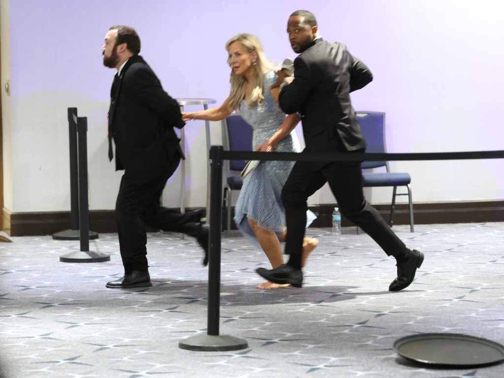 Des agents de sécurité lourdement armés interviennent alors très rapidement et évacuent le président vers la gauche de l'estrade. La musique d'ambiance s'arrête, alors que d'autres agents enjambent la table et semblent tenir en joue le public.